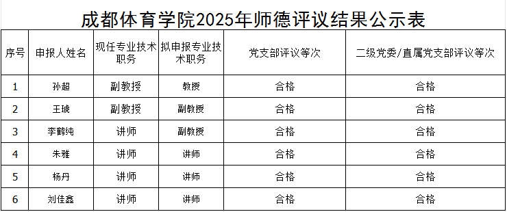 根据《成都体育学院专业技术职务评审暂行办法(2024年修订)》(成体院〔2024〕162号),现将成都体育学院运动训练学院2025年师德评议结果名单予以公示。公示时间为5个工作日,如有异议,请在公示期内向运动训练学院职称评审考核组反映。反映的问题应事实清楚,反映情况者应提供真实姓名和联系方式。